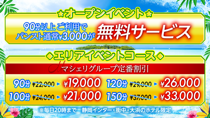 | 10時〜20時までに静岡インター付近・静岡市街中・大浜周辺のホテルをご利用されるお客様限定です!全てのお客様に上記料金にてご案内致しますので安心してお電話下さい。 150分以上ご利用のお客様はスタッフにお問い合わせください。 | |